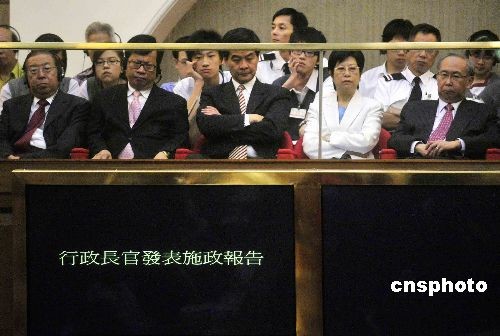 十月十五日,香港行政長官曾蔭權(quán),在立法會發(fā)表二零零八至零九年施政報告。特首夫人曾鮑笑薇及多位行政會議成員出席旁聽。中新社發(fā) 譚達明 攝