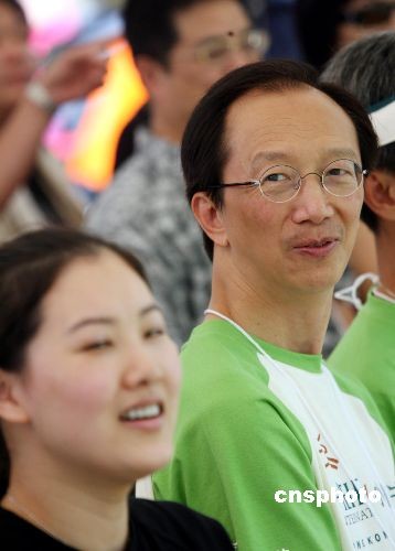 十月二十五日,國際小母牛香港分會董事局主席梁錦松、小母牛組織愛心大使伏明霞在香港維多利亞公園出席小母!案偛缴菩卸懔惆恕贝壬票荣,為四川災(zāi)區(qū)重建工作籌款。中新社發(fā) 武仲林 攝