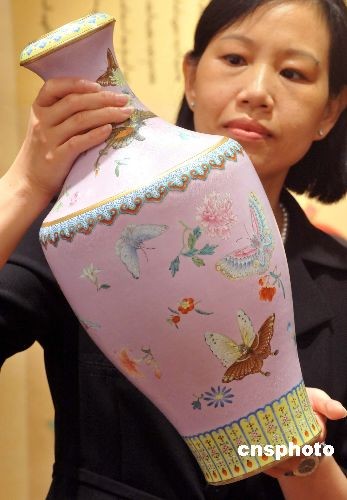 清朝乾隆御制粉紅地粉彩軋道蝴蝶瓶。