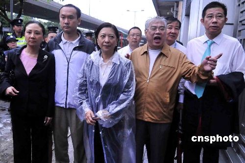 十一月三日,香港民建聯(lián)副主席蔣麗蕓(右三)及立法會議員黃定光(右二),與幾十名中小企的代表早上由遮打花園游行至政府總部,他們不滿銀行縮減信貸額,令營運資金緊絀,難以周轉(zhuǎn)。中新社發(fā) 譚達明 攝
