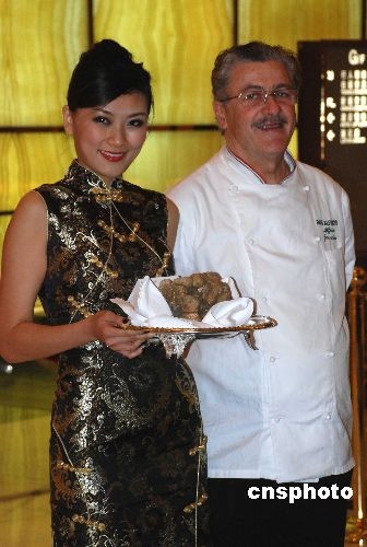 11月29日晚,在澳門、倫敦、羅馬和阿布扎比衛(wèi)星連線意大利白松露菌慈善拍賣會上,澳門博彩股份有限公司行政總裁何鴻燊以20萬美元拍得最大的一顆白松露菌。圖為禮儀小姐和廚師在澳門會場展示重1.08公斤的本年度“松露王”。中新社發(fā) 畢永光 攝