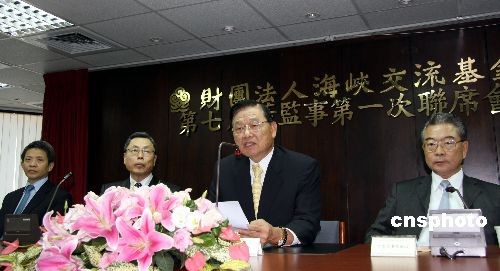 12月2日下午,海峽交流基金會(huì)在臺(tái)北舉行第7屆董監(jiān)事會(huì)第1次聯(lián)席會(huì)議,江丙坤(右二)經(jīng)推選續(xù)任海基會(huì)董事長,高孔廉(左二)、“陸委會(huì)”副主委傅棟成(左一)和知名企業(yè)家許勝雄(右一)經(jīng)推舉出任海基會(huì)副董事長,高孔廉兼任;鶗(huì)秘書長。中新社發(fā) 劉舒凌 攝