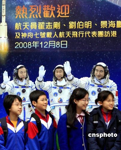十二月八日,神舟七號載人航天飛行代表團(tuán)在香港灣仔伊利沙伯體育館與香港學(xué)生真情對話。圖為活動還未開始,學(xué)生們已提早來到門口等候并與“神七”航天員海報合影留念。中新社發(fā) 張勤 攝