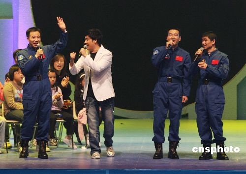十二月九日晚,澳門舉行“航天英雄·情系濠江”晚會,歡迎“神舟七號”載人航天飛行代表團一行。圖為翟志剛、劉伯明、景海鵬三位航天員與澳門歌手合唱《龍的傳人》。中新社發(fā) 武仲林 攝