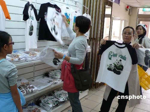大陸贈臺大熊貓“團團”“圓圓”十二月二十三日晚間抵達臺北市立動物園。動物園內(nèi)紀念品商店里的大熊貓相關(guān)商品進貨數(shù)量激增,民眾購買熱情高漲。圖為臺灣民眾在選購印有大熊貓圖案的T恤衫。中新社發(fā) 路梅 攝