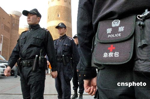 日前,烏魯木齊公安局特警支隊(duì)隊(duì)員身著最新警用裝備在該市國際大巴扎執(zhí)行巡邏任務(wù)。據(jù)了解,此次該市特警統(tǒng)一更換的新裝備中包括強(qiáng)光手電、催淚噴射器、手銬、伸縮警棍、水壺、對講機(jī)、警察工作包、急救包等,所有器具均掛在多功能腰帶上,使用起來更加便捷。新裝備中的急救包中所攜帶的治療高血壓及心臟病的急救用藥和包扎器具即可以應(yīng)對突發(fā)事件中的急救所用,還可以對巡邏過程中市民的突發(fā)病癥做暫時(shí)的急救之用。中新社發(fā) 劉新 攝