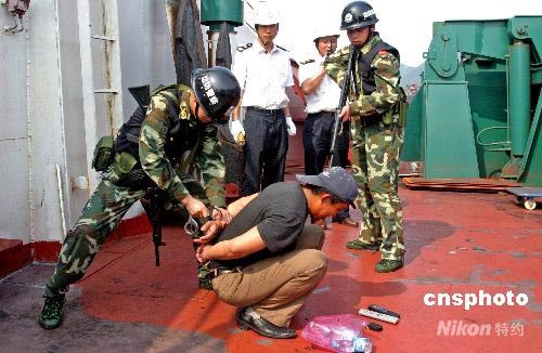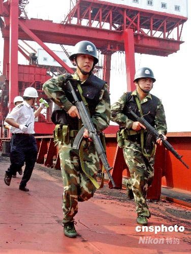 7月8日,浙江省舟山市首次舉行港口船岸反恐演習(xí),以恐怖分子搭船前往奧運比賽項目城市--青島為預(yù)想,演練舟山市海事、港務(wù)、公安、邊防等部門如何確認、搜索船上恐怖分子及排查爆炸品。此次反恐演習(xí),除了加強與地方公安機關(guān)溝通,建立反恐聯(lián)動機制外,還針對船舶、港口設(shè)施的恐怖和暴力事件的犯罪活動,進一步提高處置突發(fā)事件應(yīng)變能力,維護轄區(qū)水上人民生命財產(chǎn)安全,確保2008年北京奧運會期間舟山海域通航安全。中新社發(fā) 黃正勝 攝