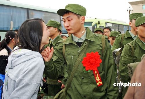 11月23日,四川眉山市首批奔赴西藏服役的新兵,告別家鄉(xiāng)踏上保衛(wèi)祖國的征程。在今年的冬季征兵中,作為地震災(zāi)區(qū)的眉山市廣大適齡青年,被來到當(dāng)?shù)貐⒓涌拐鹁葹?zāi)的英勇的部隊(duì)官兵所感動(dòng),紛紛報(bào)名應(yīng)征入伍,其中還有不少災(zāi)區(qū)青年和在災(zāi)區(qū)做志愿者的青年踴躍報(bào)名。中新社發(fā) 堯遙 攝