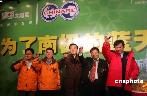 國(guó)家海洋局極地考察辦公室黨委書記魏文良(右二)、皇明太陽(yáng)能集團(tuán)董事長(zhǎng)黃鳴(右一)、第二十三次南極考察隊(duì)長(zhǎng)城站站長(zhǎng)王建國(guó)(左二)等在簽約儀式上。