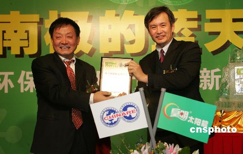 國(guó)家海洋局極地考察辦公室黨委書記魏文良(左)與皇明太陽(yáng)能集團(tuán)董事長(zhǎng)黃鳴(右)在簽約儀式上。