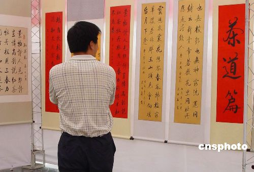 | 六月五日上午,在第三十六個(gè)世界環(huán)境日到來(lái)之際,河南省人大環(huán)資工委、省環(huán)保局、省環(huán)保聯(lián)合會(huì)、省人大書(shū)畫(huà)院在鄭州環(huán)保廣場(chǎng)隆重舉辦“紀(jì)念世界環(huán)境日,宋國(guó)華同志為政楹聯(lián)百幅(環(huán)保篇)書(shū)法作品展”,這是河南省人大常委會(huì)委員、環(huán)資工委主任宋國(guó)華同志身體力行、宣傳環(huán)保、辛勤創(chuàng)作、心血汗水的結(jié)晶。圖為一名參觀者正在欣賞書(shū)法作品。中新社發(fā) 朱曉娟 攝