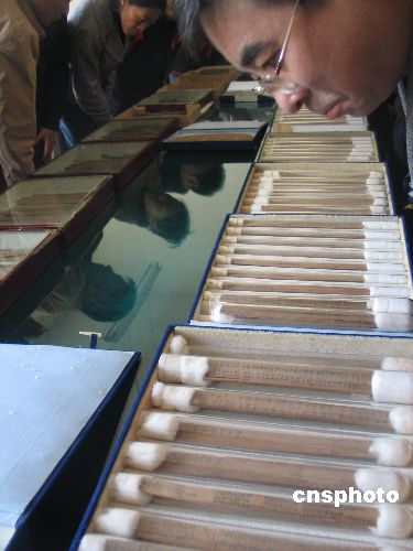 十月十八日,蘭州市民在甘肅簡牘展覽室欣賞兩千年前的漢簡。甘肅簡牘保護研究中心經(jīng)批準成立,并于十月十八日揭牌,長期擠放于陰冷庫房里的萬枚珍貴簡牘正式宣告“換新房”。甘肅先后出土簡牘六萬余枚,尤以漢簡數(shù)量最多,現(xiàn)分別收藏于英國倫敦的大英圖書館、臺北南港歷史語言研究所和甘肅。因人員、經(jīng)費原因,漢簡在甘肅保存條件很差,出現(xiàn)了變形損毀等嚴重情況。簡牘,是中華民族先民們對政治、軍事、經(jīng)濟、社會、文化等活動的記錄。中新社發(fā) 殷春永 攝