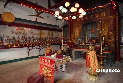 日前,經(jīng)有關(guān)專家學(xué)者考證,福州市臺(tái)江區(qū)寧化街道浦西路上的“福壽宮”曾是“明教文佛祖殿”,廟里保存著一尊清代脫胎工藝制造的明教文佛像,以及清代繪制的明教文佛祖殿全景圖掛軸,福州市文物局原局長(zhǎng)曾意丹表示,所有這些實(shí)物都已證明這座廟宇是福建省乃至全國(guó)罕見(jiàn)的又一明教(摩尼教)重要遺址。圖為“福壽宮”正殿中間寫有“明教文佛祖殿”字樣。中新社發(fā) 王東明 攝