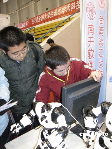 11月15日,第十屆“挑戰(zhàn)杯”飛利浦全國大學生課外學術科技作品競賽決賽在南開大學開幕。在學生科技作品展示環(huán)節(jié)中,由南開大學與臺灣淡江大學合作研發(fā)的“mychannel虛擬電視臺”和“桌面機器人輔助多模即時交流平臺”格外引人關注。淡江大學參賽隊指導教師蕭瑞祥介紹:“從決定合作到作品完成,經歷了將近一年時間。中新社發(fā) 田齊 攝
