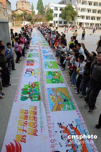 2008年4月17日下午,湖北省南漳縣實(shí)驗(yàn)小學(xué)舉辦了“攜手繪福娃,同心迎奧運(yùn)”百米畫(huà)卷啟動(dòng)儀式。全校學(xué)生將一幅幅福娃淋漓盡致地描繪在百米長(zhǎng)卷上,用實(shí)際行動(dòng)迎接今年8月的北京奧運(yùn)會(huì)到來(lái)。作者: 熊明銀