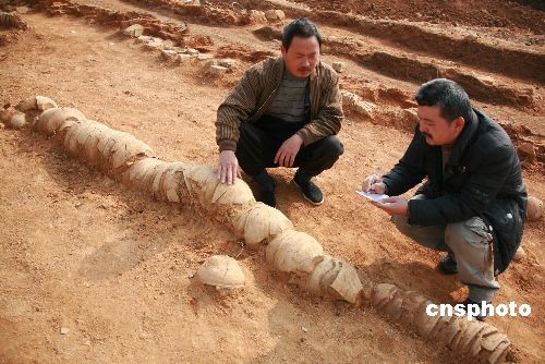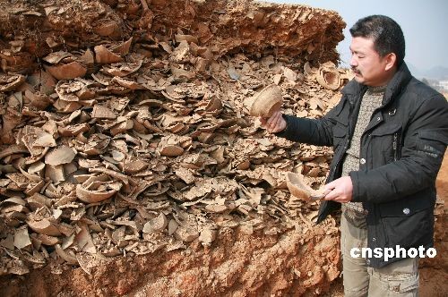 2008年12月20日,歙縣北宋龍窯遺址發(fā)掘現場。近日,安徽歙縣桂林鎮(zhèn)發(fā)現一處北宋龍窯遺址,面積達3700多平方米,出土了大量精美青瓷珍貴文物。經安徽省考古專家勘察鑒定為北宋時的龍窯,主要生產陶器和青瓷,專家分析至少有上千件珍稀文物。該處北宋龍窯遺址于2008年9月開挖績黃高速公路3標段連接線時發(fā)現。中新社發(fā) 方也廣德 攝