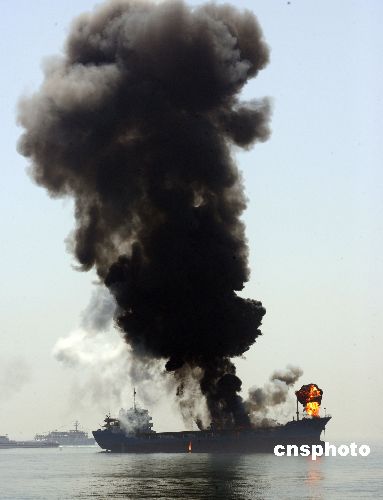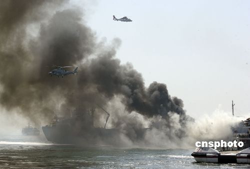 | 6月5日上午,渤海海域溢油應急演習在秦皇島港西錨地附近海域進行。演習模擬萬噸油輪在進港時突然發(fā)生起火爆炸,500噸原油溢出。秦皇島海上溢油應急反應中心迅速向海上搜救中心報告,并啟動渤海海域船舶污染應急聯(lián)動協(xié)作機制、河北省海域重大污染事件應急聯(lián)合行動機制,協(xié)調渤海沿岸天津、遼寧、山東、河北專業(yè)及社會應急力量全力清污。此次演習的主題是“維護海洋環(huán)境安全,推進平安交通建設”。演習動用船艇22艘、直升飛機2架,參演人數(shù)500余人,其中參加岸灘演習的社會志愿者達300多名。中新社發(fā) 周雪峰 攝