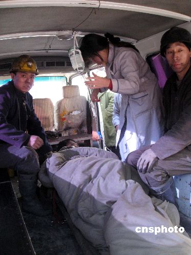 圖為獲救礦工被救護(hù)車送往醫(yī)院救治。
