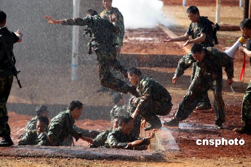 圖為中國士兵練習(xí)通過水坑。