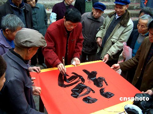 12月30日,書法家在仙回瑤族鄉(xiāng)伏龍村為瑤胞書寫春聯(lián)。當日,廣西昭平縣書法家協(xié)會10名書法家自帶筆墨紙張和伙食,驅車來到大山深處的仙回瑤族鄉(xiāng)伏龍村,現(xiàn)場為150戶瑤胞書寫春聯(lián)、贈送春聯(lián),為瑤胞送來新年祝福。中新社發(fā) 喻湘泉 攝