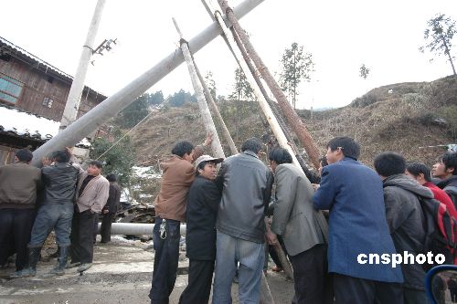 2月14日,貴州雷山縣丹江鎮(zhèn)白巖、羊排苗寨的苗族農(nóng)民在雪災(zāi)過后抓緊時間搶修電路和抓緊春耕生產(chǎn)。中新社發(fā) 吳興權(quán) 攝