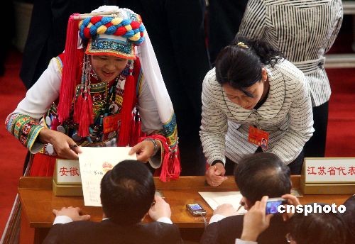 3月17日下午,十一屆全國(guó)人大一次會(huì)議在北京人民大會(huì)堂舉行第七次全體會(huì)議,決定國(guó)務(wù)院副總理、國(guó)務(wù)委員、各部部長(zhǎng)、各委員會(huì)主任、中國(guó)人民銀行行長(zhǎng)、審計(jì)署審計(jì)長(zhǎng)及國(guó)務(wù)院秘書長(zhǎng)人選;表決全國(guó)人大各委員會(huì)主任委員、副主任委員、委員名單草案。在投票表決間隙,一些全國(guó)人大代表抓緊時(shí)機(jī)在各代表團(tuán)坐席請(qǐng)省領(lǐng)導(dǎo)簽名留念。 中新社發(fā) 張宇 攝