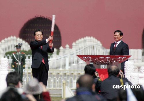 3月31日上午,北京奧運會火炬接力啟動儀式在北京天安門廣場舉行,中國國家主席胡錦濤舉起點燃的火炬,向在場的觀眾展示,現(xiàn)場爆發(fā)出熱烈的掌聲和歡呼聲。作者: 張宇
