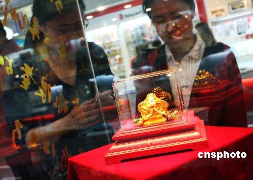4月7日,由北京奧組委授權(quán)發(fā)行的“北京奧運(yùn)徽寶黃金珍藏版”在北京王府井熱銷。“北京奧運(yùn)徽寶黃金珍藏版”全球限量發(fā)行5000方,每方售價(jià)為人民幣18.8萬元,其主體是以500克千足金為質(zhì)材的印章,由精雕細(xì)琢的硬木漆紅嵌銀絲寶盒包藏。 鄭雄增 攝