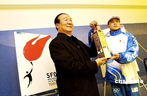 圖為北京奧組委執(zhí)行副主席蔣效愚和圣火護衛(wèi)員共舉圣火燈。作者: 陳鋼