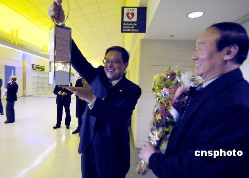 中國駐美大使周文重(左)從北京奧組委執(zhí)行副主席蔣效愚(右)手中接過奧運圣火燈后高高舉起。作者: 陳鋼