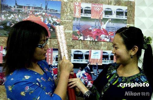 首棒火炬手、前奧運游泳冠軍林莉(左)介紹祥云火炬的構(gòu)造。 陳鋼 攝