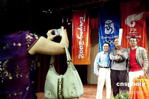 北京奧運會祥云火炬在舊金山展出,華人華僑爭相與祥云合影。陳鋼 攝