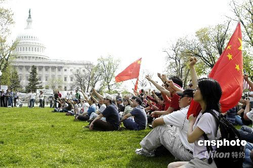 當(dāng)?shù)貢r(shí)間4月19日,近千名中國留學(xué)生和當(dāng)?shù)氐娜A僑華人在美國國會山前舉行示威活動(dòng),支持北京奧運(yùn),反對CNN丑化中國的評論。圖為千名留學(xué)生在國會山前振臂高呼:“不要歪曲報(bào)道!不要支持暴力!支持和平,支持奧運(yùn)!” 中新社發(fā) 邱江波 攝