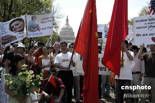 當(dāng)?shù)貢r(shí)間4月19日,近千名中國(guó)留學(xué)生和當(dāng)?shù)氐娜A僑華人在美國(guó)國(guó)會(huì)山前舉行示威活動(dòng),支持北京奧運(yùn),反對(duì)CNN丑化中國(guó)的評(píng)論。圖為千名留學(xué)生在國(guó)會(huì)山前振臂高呼:“不要歪曲報(bào)道!不要支持暴力!支持和平,支持奧運(yùn)!” 中新社發(fā) 邱江波 攝