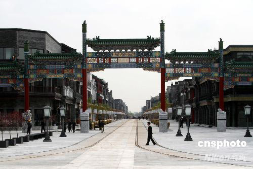 2008年4月21日,北京前門(mén)大街改造工程基本修整完畢,其正陽(yáng)門(mén)及兩旁的建筑已展露出較強(qiáng)的明清時(shí)代的風(fēng)韻。今年“五一”,前門(mén)步行街將對(duì)游人開(kāi)放。中新社發(fā) 任丘 攝