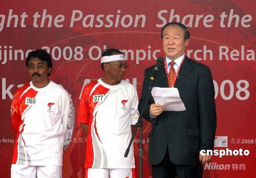 4月22日下午3時30分,印尼青體部部長阿迪亞克薩·道爾特用手中的“祥云”火炬點燃圣火盆,北京奧運圣火在雅加達的傳遞順利結(jié)束。北京奧運圣火雅加達站傳遞從蘇加諾體育中心東門開始后,八十名火炬手圍繞其中的蘇加諾體育場進行七公里左右的傳遞。八十位火炬手中,有印尼現(xiàn)役和退役優(yōu)秀運動員、贊助商代表、政府官員、社會活動家等。21日晚10時,北京奧運圣火將離開雅加達,前往下一站——澳大利亞的堪培拉。圖為北京奧組委執(zhí)行副主席蔣效愚(右)在慶典儀式上致辭。中新社發(fā) 沈晨 攝