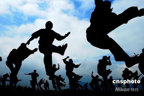 4月下旬,河南登封塔溝武校的練武少年在勤練武功。在聞名海內(nèi)外的河南省登封市少林寺周?chē)刻於加袛?shù)萬(wàn)人在習(xí)武,練武林中的絕活,他們用精湛武藝展示飛檐走壁、童子功、氣功等。中新社發(fā) 高山岳 攝