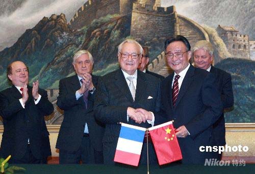 4月25日,全國(guó)人大常委會(huì)委員長(zhǎng)吳邦國(guó)在北京人民大會(huì)堂與法國(guó)參議院議長(zhǎng)蓬斯萊舉行會(huì)談。會(huì)后雙方簽署了中華人民共和國(guó)全國(guó)人民代表大會(huì)與法蘭西共和國(guó)參議院建立定期交流機(jī)制的協(xié)議。中新社發(fā) 廖文靜 攝
