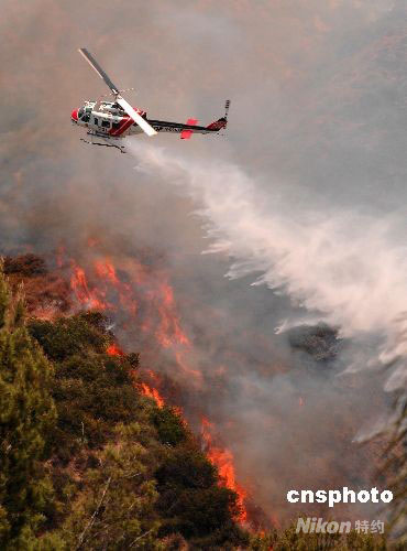 當(dāng)?shù)貢r(shí)間四月二十八日,消防直升機(jī)正在向著火區(qū)域撒下阻燃劑。洛杉磯近郊Sierra Madre的山林大火已經(jīng)燃燒了三天,過火面積近五百英畝,部分著火點(diǎn)距離居民區(qū)很近。當(dāng)天,當(dāng)?shù)刂行W(xué)全部停課,約一千名當(dāng)?shù)鼐用癖黄染o急撤離。這是當(dāng)?shù)厝嗄陙碜畲蟮纳搅执蠡。消防部門稱,美國聯(lián)邦、加州、洛杉磯縣和當(dāng)?shù)氐牧倜绬T正在現(xiàn)場(chǎng)滅火,至今沒有人員傷亡的報(bào)告。中新社發(fā) 張煒 攝