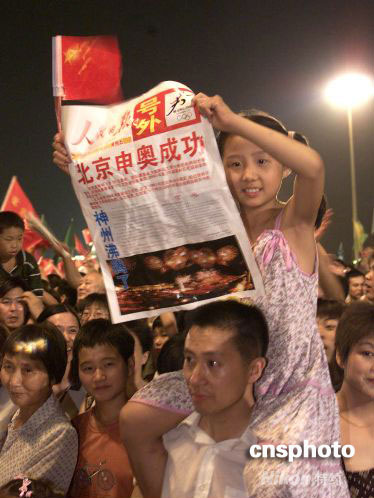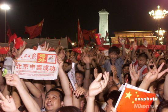 2001年7月13日夜,北京天安門廣場(chǎng)聚集數(shù)十萬民眾,慶祝北京申奧成功。毛建軍 攝