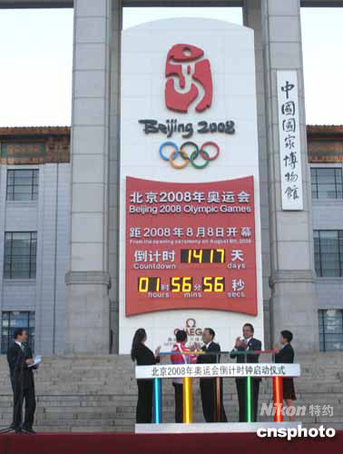 2004年9月21日18時整,二零零八年北京奧運(yùn)會“倒計(jì)時鐘”在中國國家博物館門前豎起。史利 攝