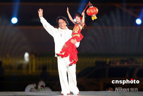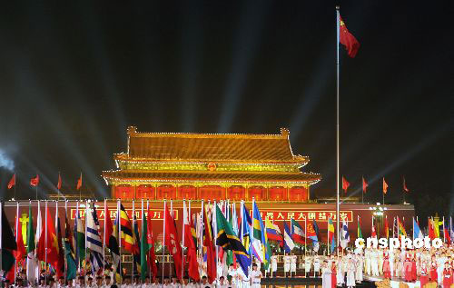 2007年8月8日晚,“北京奧運(yùn)會(huì)倒計(jì)時(shí)一周年慶祝活動(dòng)”在天安門廣場(chǎng)舉行。中新社發(fā) 任海霞 攝