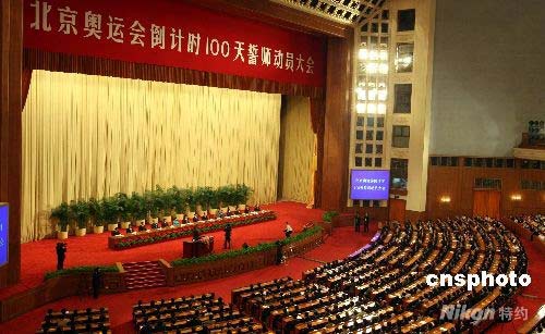 四月三十日,北京奧運(yùn)會倒計(jì)時100天誓師大會在人民大會堂舉行。 中新社發(fā) 任海霞 攝