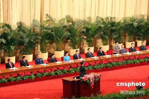 四月三十日,北京奧運(yùn)會(huì)倒計(jì)時(shí)100天誓師大會(huì)在人民大會(huì)堂舉行。全國(guó)政協(xié)主席賈慶林等領(lǐng)導(dǎo)出席。中新社發(fā) 任海霞 攝