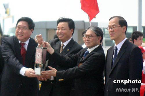 北京奧組委執(zhí)行副主席楊樹安(左二)與香港奧委會會長霍震霆(右二)、中聯(lián)辦主任高祀仁(左一)等共舉圣火燈。 中新社發(fā) 沈晨 攝