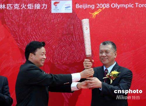 圖為澳門特別行政區(qū)行政長官何厚鏵(右)、北京奧組委執(zhí)行副主席楊樹安等出席起跑儀式。中新社發(fā) 武仲林 攝