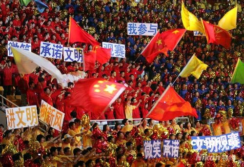 5月4日,“微笑北京、志愿奧運(yùn)——北京奧運(yùn)會(huì)、殘奧會(huì)志愿者誓師大會(huì)”在北京舉行,來自北京多所大學(xué)的學(xué)生代表所有志愿者,手舉標(biāo)語、揮舞國旗,并莊嚴(yán)宣誓。據(jù)悉,北京奧運(yùn)會(huì)、殘奧會(huì)賽會(huì)志愿者報(bào)名人數(shù)超過112萬,城市志愿者人數(shù)超過157萬。中新社發(fā) 張宇 攝