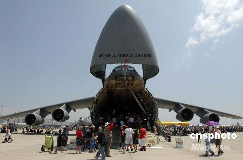 位于美國南加州河濱縣的一個(gè)美國空軍預(yù)備基地當(dāng)?shù)貢r(shí)間5月4日舉行規(guī)模盛大的航空展和飛行表演。C-17A全球霸王運(yùn)輸機(jī)、C-5銀河運(yùn)輸機(jī)等空中巨無霸和F-22猛禽戰(zhàn)機(jī)等美軍先進(jìn)軍用飛機(jī)亮相展覽,F(xiàn)-22戰(zhàn)機(jī)飛行表演、美國空軍“雷鳥”飛行隊(duì)的特技表演等令近十萬民眾大飽眼福。圖為民眾參觀空中巨無霸C-5銀河運(yùn)輸機(jī)。中新社發(fā) 張煒 攝
