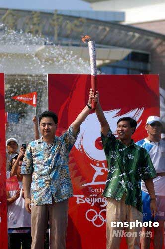 2008年5月5日下午,傳遞奧運圣火的隊伍抵達海南博鰲,開始在萬泉河畔的紅色娘子軍之鄉(xiāng)瓊海市傳遞。中新社發(fā) 蒙鐘德 攝