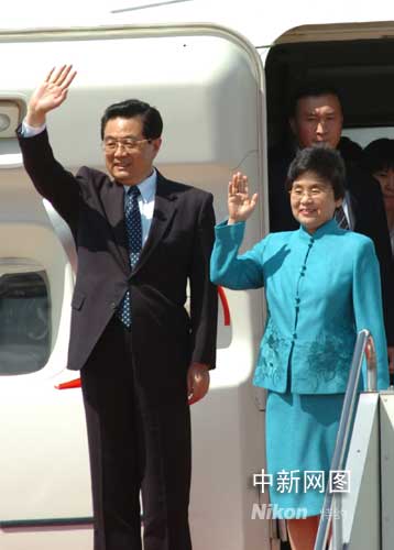 當(dāng)?shù)貢r間5月6日下午1點45分左右,中國國家主席胡錦濤乘專機抵達日本羽田機場,開始對日本為期5天的國事訪問。圖為胡錦濤主席及夫人劉永清在機艙門口向歡迎人群揮手致意。中新社記者 朱沿華 攝